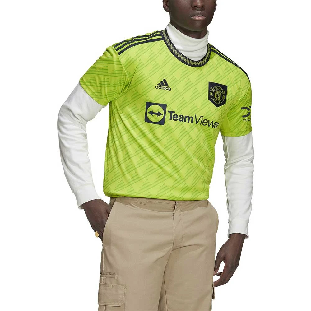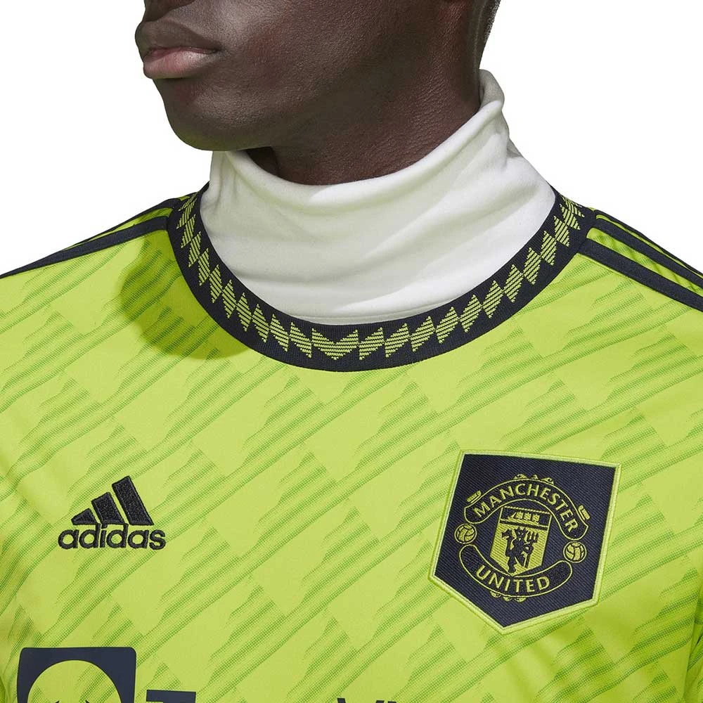 Created to catch the eye at rivals’ grounds. This adidas Manchester Untied third jersey highlights electrifying away performances with bold colors and a dynamic, ’90s-style graphic. Shared with the home and away kits, an embroidered shield badge takes pride of place on the chest. Behind the brilliance, moisture-absorbing AEROREADY keeps soccer fans comfortable. Made with 100% recycled materials, this product represents just one of our solutions to help end plastic waste.