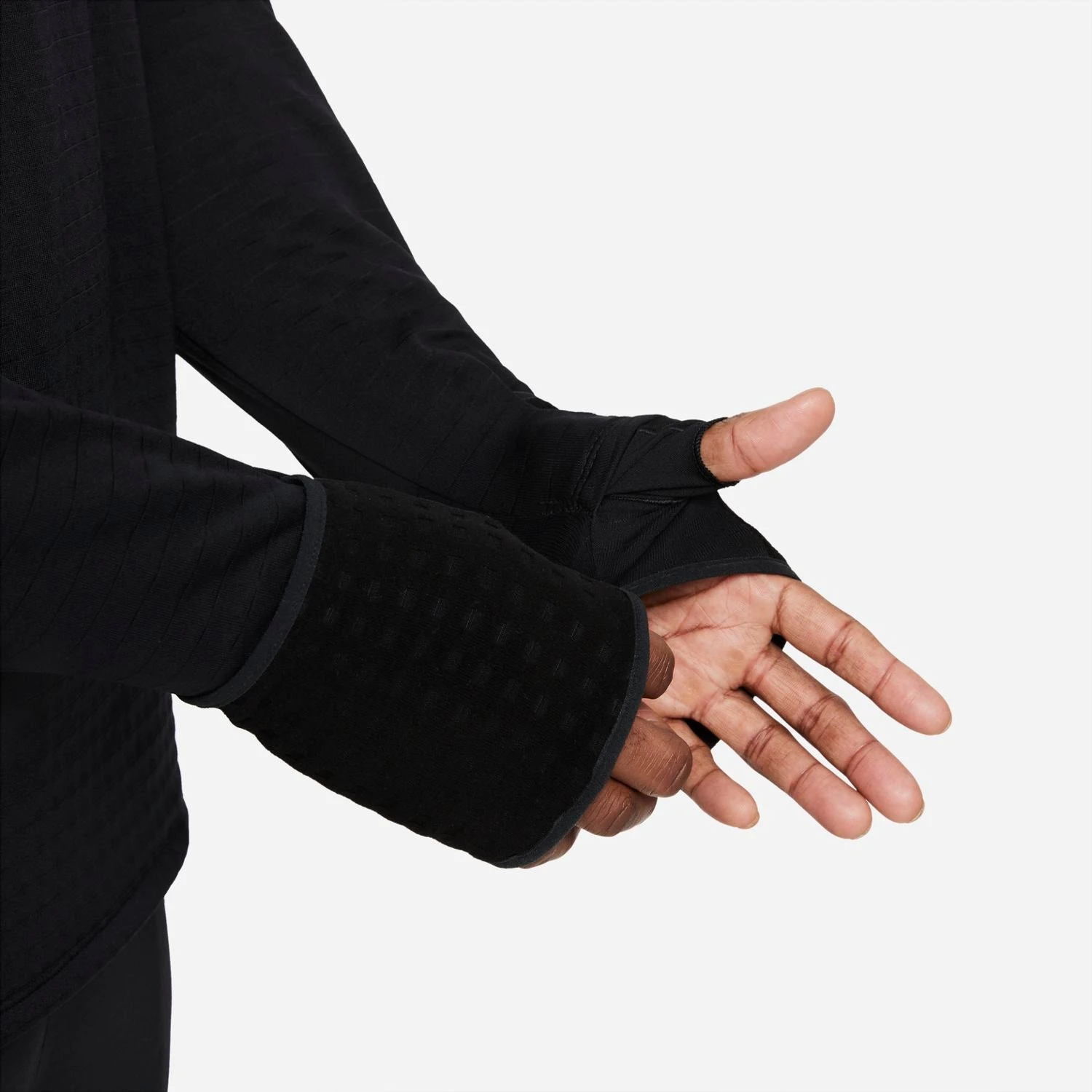 Your run doesn’t stop when rain begins. With the Nike Therma-FIT Repel Element Top, you’ll have soft, warm fabric—made with at least 75% recycled polyester fibers—with water-repellent properties to help keep you comfortable in wet weather. A 1/2 zip design lets you control your airflow, while a 3-way mitten system gives you options when it comes to extra coverage. Its lightweight and versatile design lets you wear it as a mid-layer or only layer.